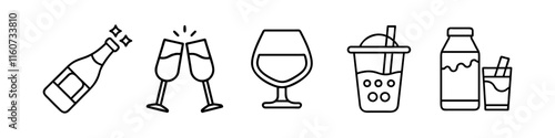 Line Icons of Drinks and Beverages - Minimalistic line icons showcasing a variety of drinks, including beer, cocktails, coffee, bubble tea, wine, and bottled beverages.