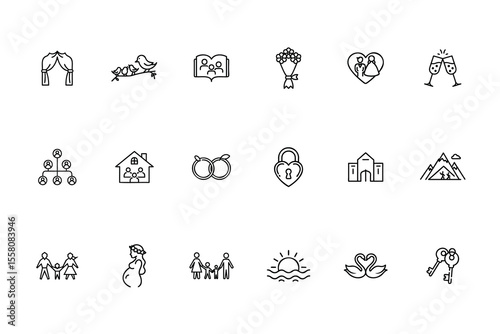 Line icons of wedding family symbols including birds flowers rings lock keys love