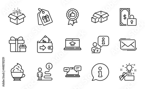 Line icons set. Included icon as Creative idea, Wallet, Open box signs. Internet chat, Coupons, Packing boxes symbols. Positive feedback, Private payment, Website education. Messenger mail. Vector