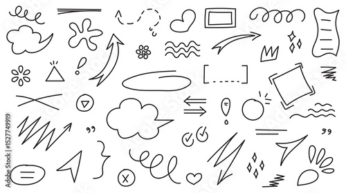 Line marker hand drawn brush arrow element set. Sketch pencil stroke vector graphic pen underline scribble icon. Hand drawn line heart, crown, star symbol highlight marker shape. Vector illustration