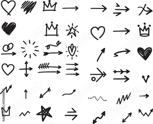 Line marker hand drawn brush arrow element set. Sketch pencil stroke vector graphic pen underline scribble icon. Hand drawn line heart, crown, star symbol highlight marker shape.eps