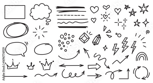 Line movement element hand drawn chalk effect decoration shape. Hand drawn cute doodle line element arrow, emphasis, shock, sparkle. Motion cartoon movement chalk icon. Vector illustration