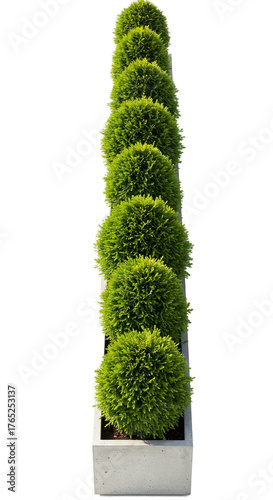 Line of Lush Green Spherical Boxwood Bushes in Concrete Planters