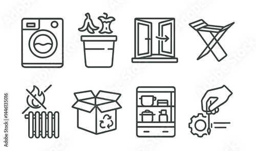 Line style icons of household sustainability behaviors: laundry on cold, compost kitchen bin, window open icon, drying rack sign, heat off badge, material reuse box, efficient shelf,