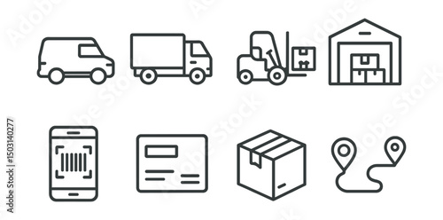 Line style icons of logistics and delivery: delivery van, cargo truck, forklift icon, warehouse, barcode scan, shipping label, parcel icon, route optimization.