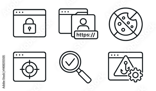 Line style icons of privacy protection: eye off icon, hidden profile, data mask, privacy shield, secure browsing, private message, ID protection, user lock.