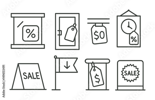 Line style icons of retail sale signs: window sticker percentage, entry door discount tag, shelf price card, poster with clock, table tent sale sign, flag with price drop, rack tag icon, store