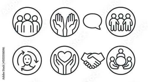 Line style icons of wellness and healthy living: support system icon, helping hands badge, open talk bubble, friendship ring icon, empathy arrows, sharing safely icon, mutual care handshake, wellness