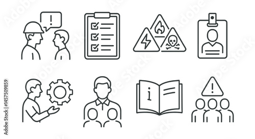 Line style icons of workplace training: safety briefing, checklist board, hazard symbols, worker ID, gear demonstration, shift leader, training booklet, group alert.