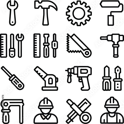 Line vector set of construction and repair tools icons including workers and drills