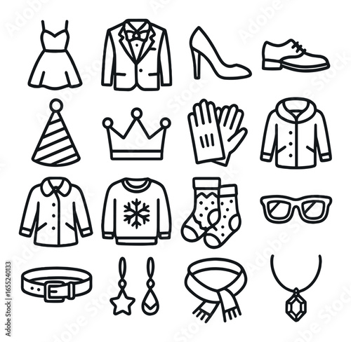 Linear fashion icon set featuring dress, suit, heels, shoes, hat, crown, gloves, sweater, socks, glasses, belt, earrings, scarf, necklace