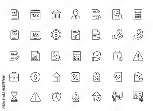 Linear outline tax icons with editable strokes. Vector illustration of personal, corporate, finance, accounting, bookkeeping, tax relief, payment, document, report, adviser and more.