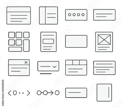 Linear user interface icon set featuring text, grid, map, browser, home, form, menu, navigation, and media symbols