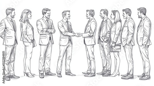 Linear vector illustration set of negotiating business people. Diverse men and women at business meetings, conclude an agreement, agree on cooperation, negotiate, shake hands, sell goods and services