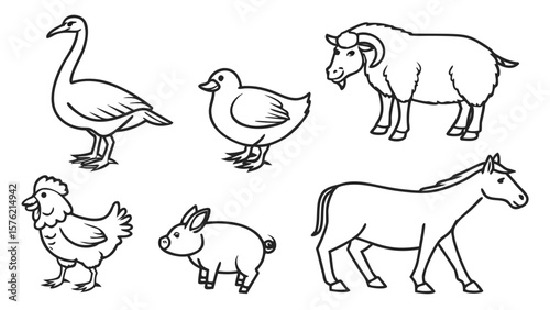 "Linear vector illustrations of domestic farm animals, clean outline style, white background, monochrome set of goose, turkey, chick, duck, sheep, horse, pig, donkey, and ox"