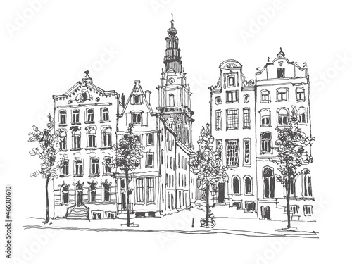 Liner sketch of houses in Amsterdam, Holland, hand drawing sketch, graphic illustration. Urban sketch in black color isolated on white background. Hand drawn travel postcard. Travel sketch.