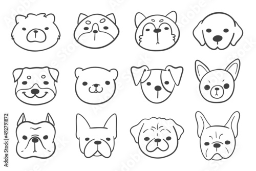 Lines of the faces of various breeds of dogs decorate coloring book for kids