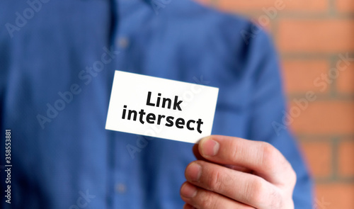Link intersect seo text on a white sign in the hand of a man in shirt