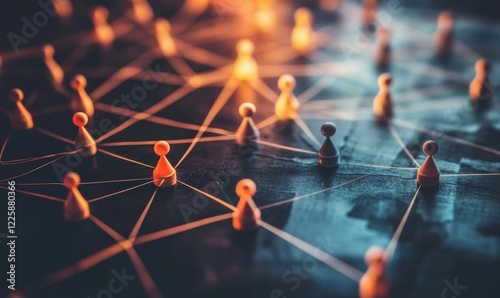 Linked game pieces with glowing lines, dark surface.