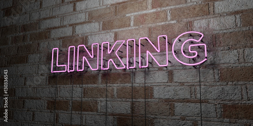 LINKING - Glowing Neon Sign on stonework wall - 3D rendered royalty free stock illustration. Can be used for online banner ads and direct mailers..