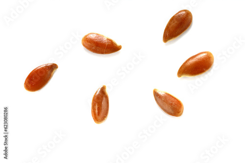Linseed, flaxseed, linum seeds isolated on white. Healthy food pile background. Diet, vegetarian or clean eating concept. Macro close-up shot.