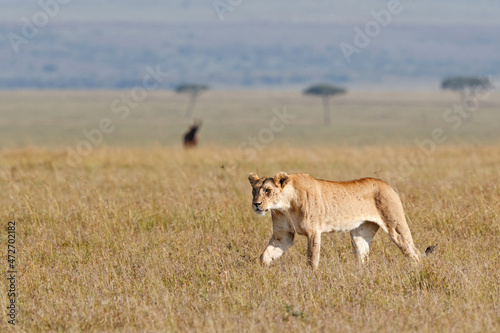 Lion female walking over the plains of the Masai Mara Game Reserve in Kenya