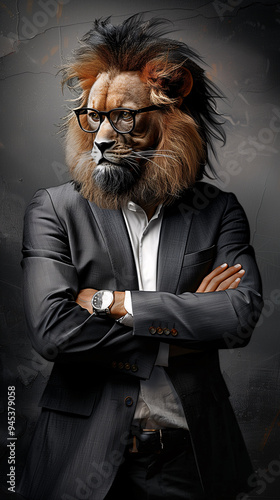 Lion head wearing a suit and tie, representing the concept of leadership and power in the business world