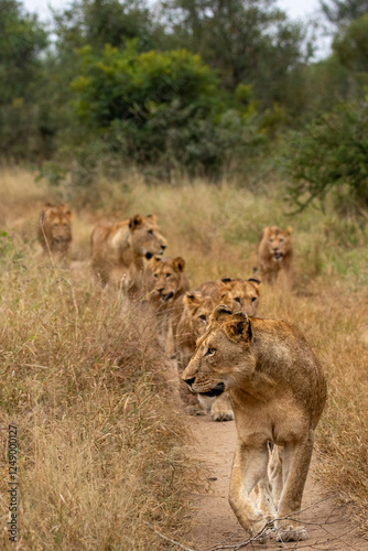Lion, Panthera leo, pride walking.