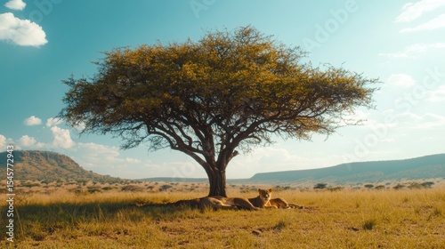 Lion pride resting under a shady tree in the heat of the day