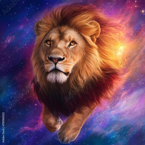 Lion prowling across a glowing cosmic void, its mane shimmering with interstellar light