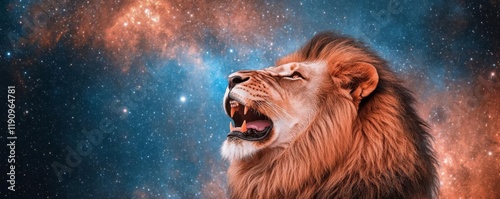 Lion roaring under a celestial sky filled with glowing constellations
