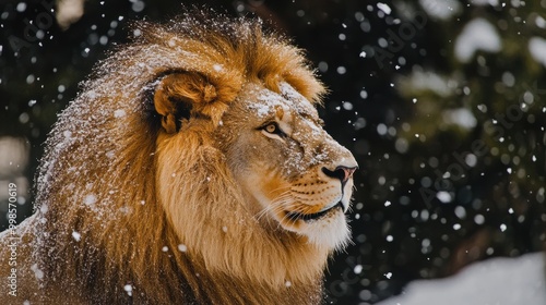 Lion with snowflakes on mane looking majestic. Wildlife photography