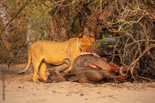 Lioness (Panthera leo) eating from a killed Cape buffalo