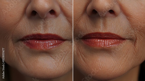 Lip filler results in a before-and-after comparison, featuring deep lines and wrinkles before and smooth, plump, youthful skin around the lips after treatment