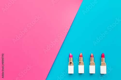 Lipsticks assorted colors on blue and pink background top view copyspace