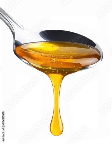Liquid Gold Honey Dripping From A Spoon Isolated Against A White Background