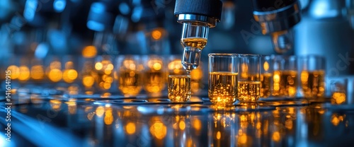Liquid handler dispenses into test tubes on a mirrored surface with a bokeh background