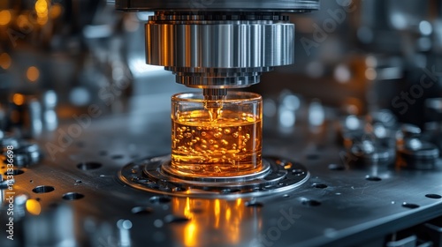 Liquid in glass jar being processed by industrial machine with metal parts.