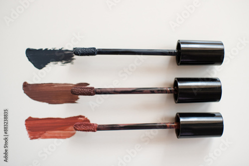 Liquid lipstick swatches in dark pastel colors close up. Beauty make up products.