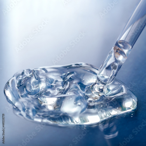 Liquid transparent gel serum swatch with pipette on blue color glass background. Cosmetic product for skin care or medical clear liquid gel. Square Close up