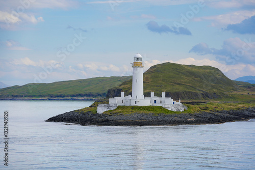 Lismore Lighthouse on Eilean Musdile in Scotland. It is a lighthouse on a small islet in the south west of Lismore island.