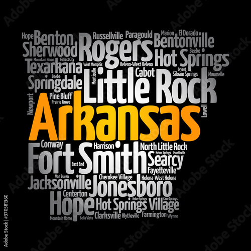 List of cities in Arkansas USA state, map silhouette word cloud, map concept background