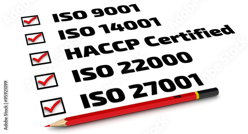 List of ISO standards: iso 9001; iso 14001; haccp; iso 22000; iso 27001. Red pencil and a checklist with red marks