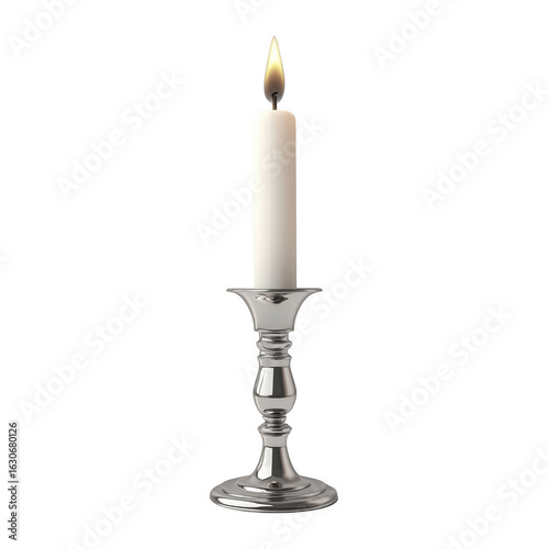 Lit candle in a silver candlestick on a transparent background illustrating light and celebration
