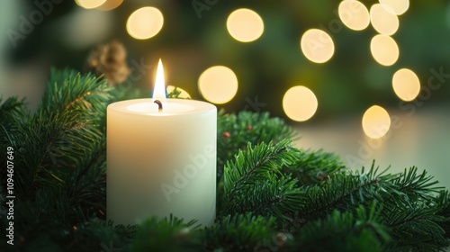 Lit Candle Nestled Among Evergreen Branches And Lights