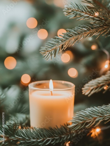 Lit Candle on Evergreen Branch with Warm Bokeh