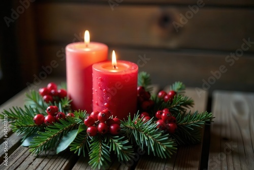 Lit candles in festive berry wreath, Christmas elements, rustic wood backdrop , christmas decor, holiday