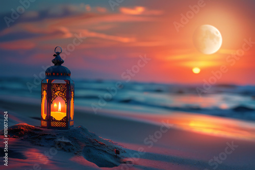Lit lantern on a tranquil beach at sunset with warm candlelight and ocean view