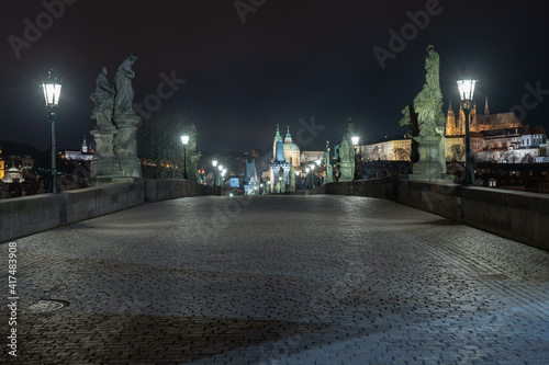 lit lanterns and illuminated statues and sidewalk with cobblestones on an empty charles bridge at night during a lockdown