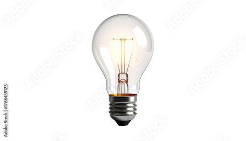 Lit light bulb with a clear glass enclosure and glowing filament against a stark black background, showcasing its illumination
